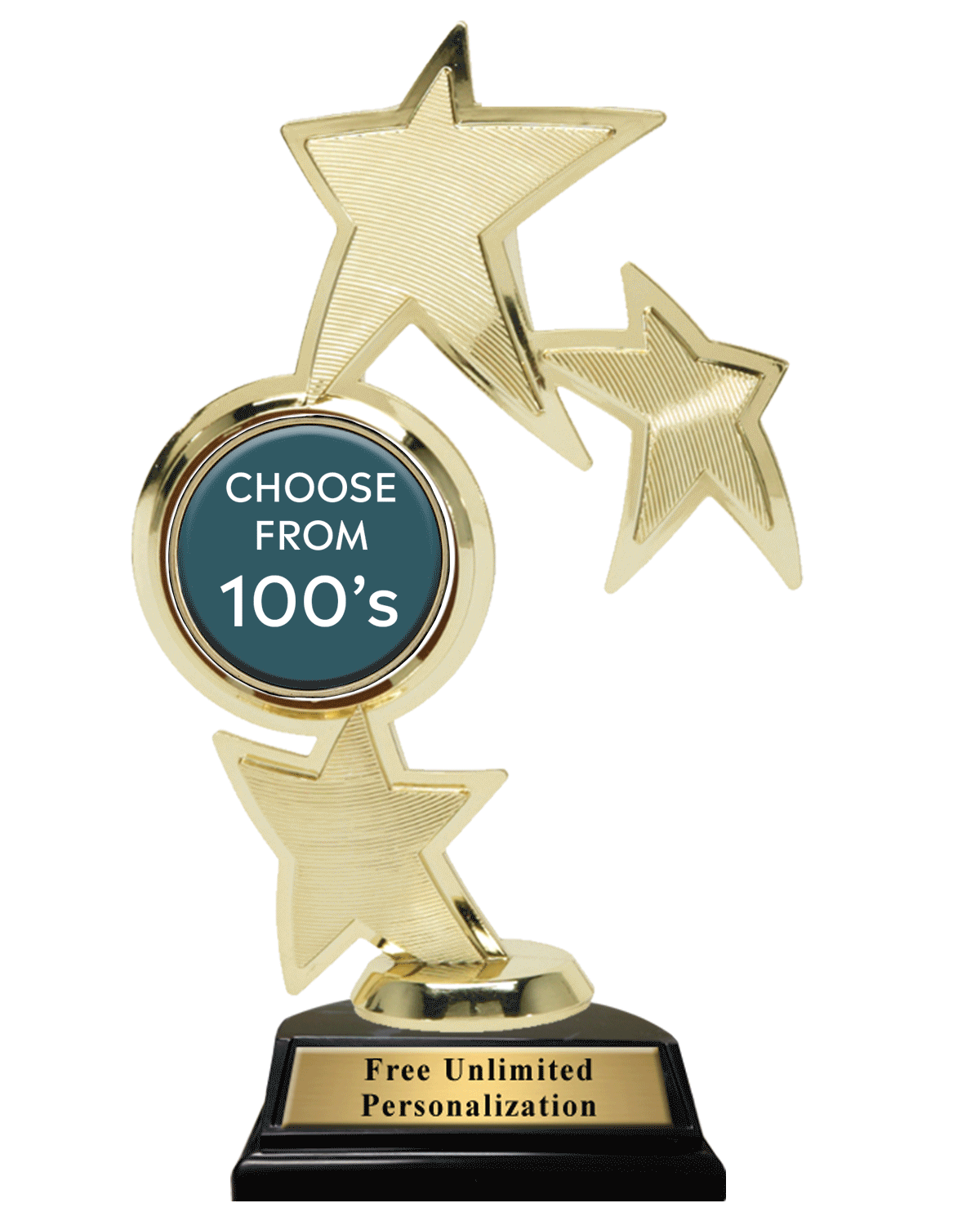 The 9.5″ Triple Star Spin Insert Trophy is a great way to add some color to your awards this year! These trophies feature three shiny gold stars surrounding a spinning full color insert. The best part about this great trophy is that you can pick one of our colorful inserts from our list of hundreds of activities and sports.